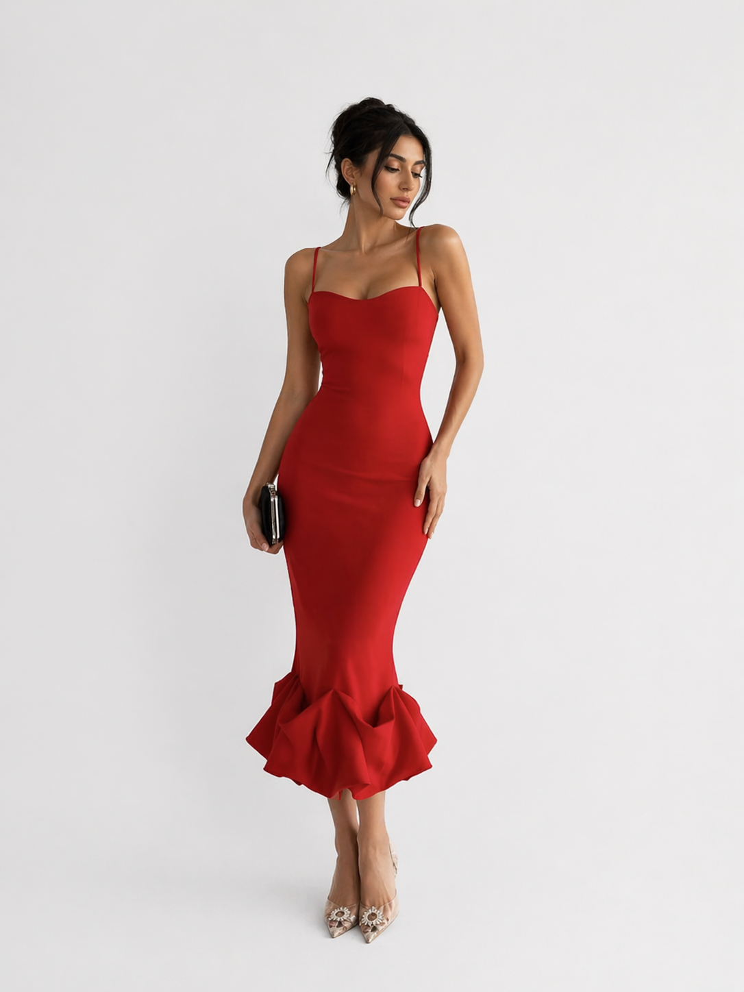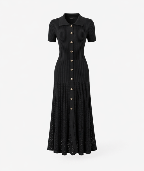 A refined balance of structure and softness, this ribbed black maxi dress embodies understated elegance. Designed with a tailored, body-contouring silhouette, it features a classic collared neckline and a full button-front closure adorned with subtle metallic accents for a polished finish. The finely ribbed knit enhances the form while offering comfortable stretch, gracefully skimming the figure before flowing into a softly flared hem with delicate openwork detailing. Effortlessly sophisticated, this piece transitions seamlessly from day to evening, making it a timeless addition to any wardrobe.